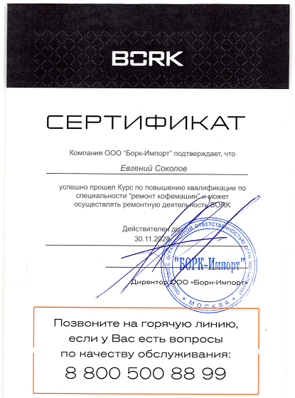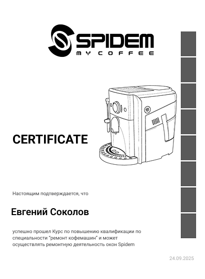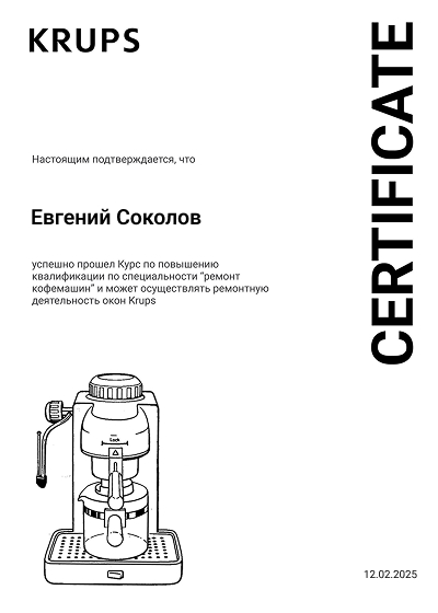 Должность: Старший инженер по ремонту автоматических кофемашин Saeco и Philips.
